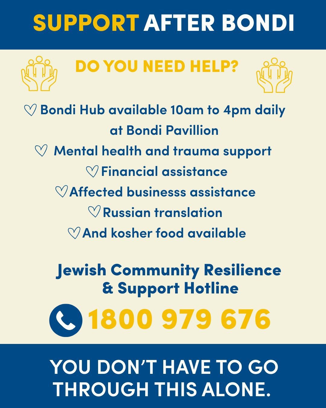 Anyone in need of support can call 1800 979 676 and to be directed to the appropriate service including those offered below through Jewish Care or Jewish House. Crisis response services available include meals, financial, psychological, and family support.